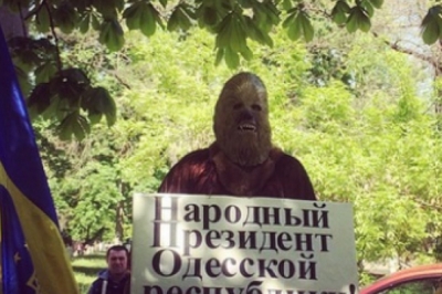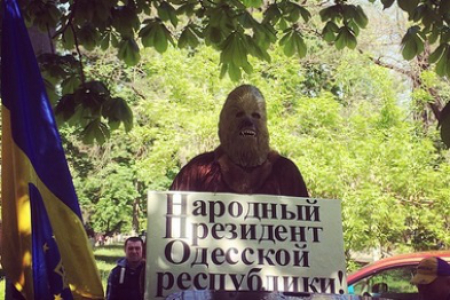 Як передає кореспондент УНІАН, до будівлі медустанови приїхали кілька десятків автомобілів з українськими прапорами і штандартами Одеси. Один із активістів в масці персонажа кіносаги "Зоряні війни" Чубакки зображував кандидата в "народні президенти" сепаратистської "Одеської республіки". Активіст тримав однойменний плакат і оголошував "передвиборну програму". Свій передвиборчий штаб він вирішив розмістити у психіатричній лікарні, і тут же хоче організувати мерію.