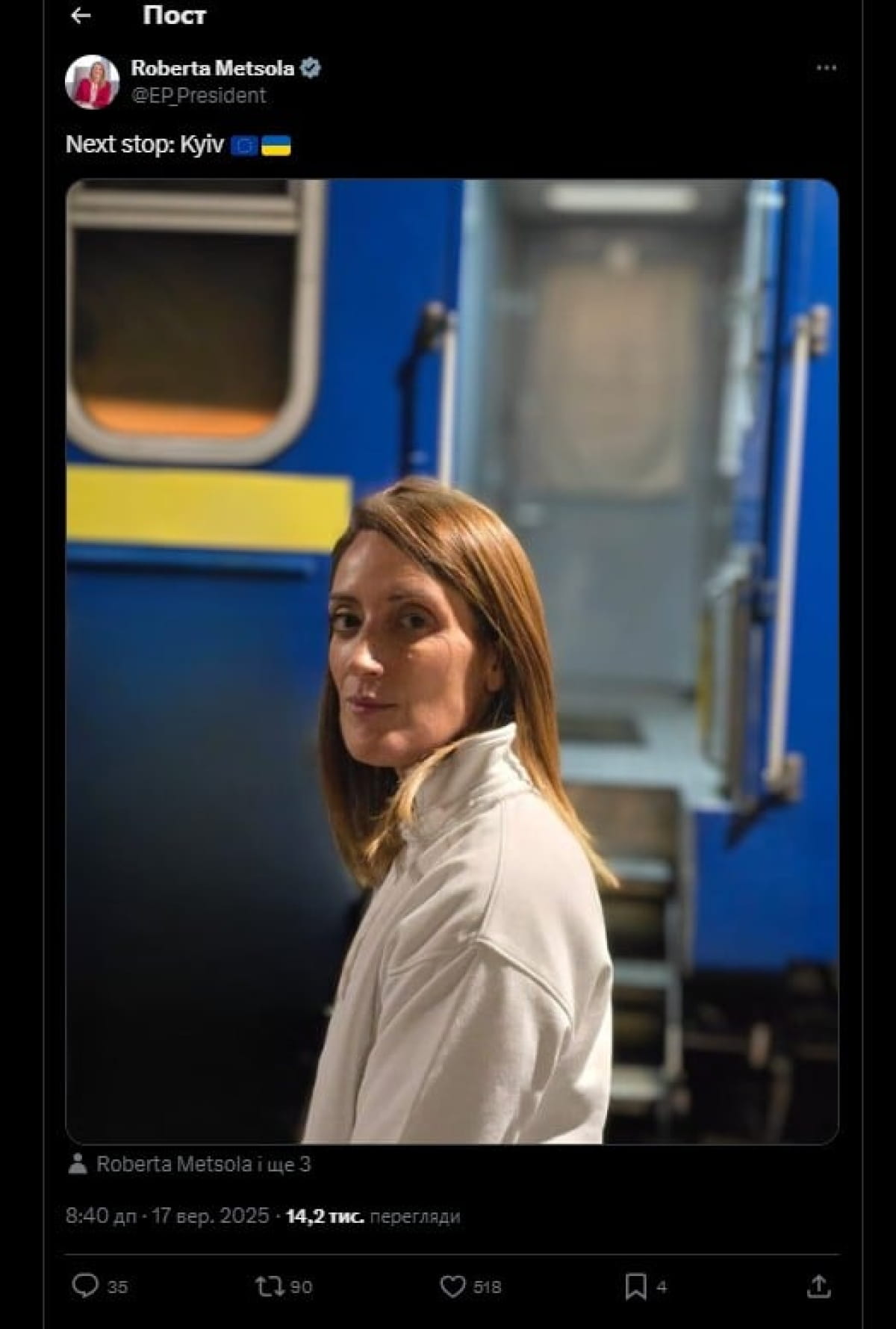 Близько 8:40 ранку Мецола опублікувала у соцмережі Х фото на фоні потягу з підписом:
