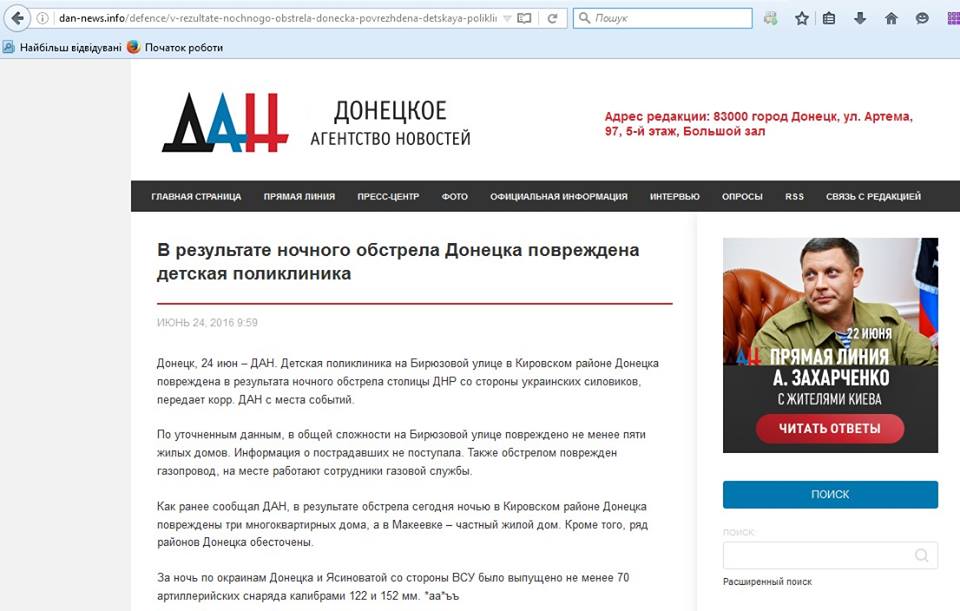 Прес-офіцер Спільного центру з контролю та координації питань припинення вогню та стабілізації лінії розмежування сторін (СЦКК) Віталій Іванов на сторінці прес-центру штабу АТО оприлюднив термінове повідомлення. З його слів, 24 червня 2016 року на сайті окупаційної адміністрації міста Донецьк було розміщено довідку про обстріли житлового фонду міста Збройними силами України. А вже за дві години, о 9:59, проросійські інформаційні ресурси зарясніли такими заголовками "Ночной обстрел Донецка: повреждены многоквартирные дома и детская поликлиника", "Улица Бирюзова после ночного украинского обстрела".