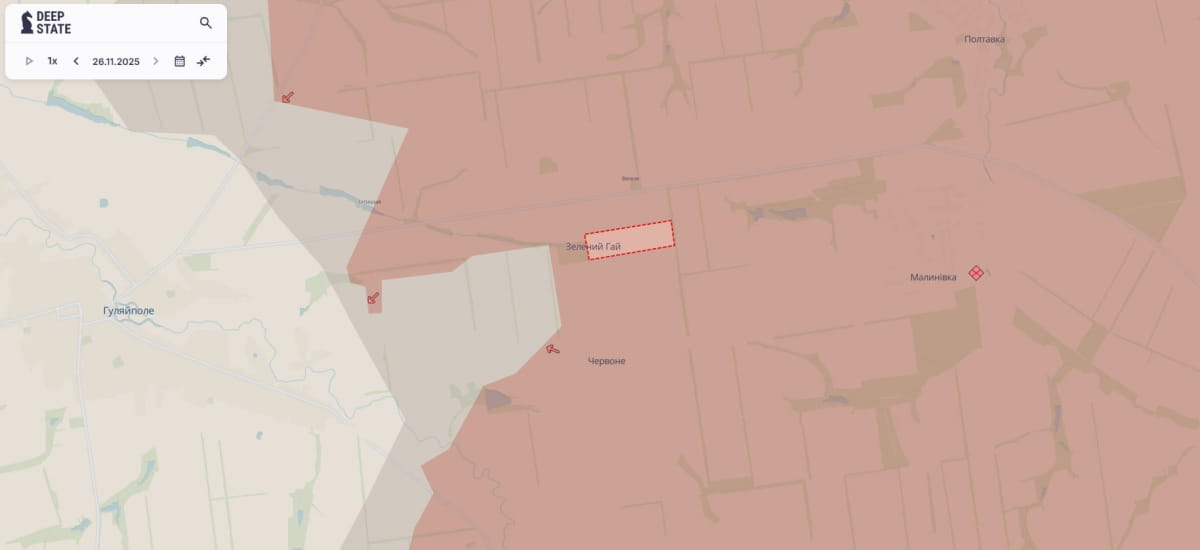 Російські війська захопили населений пункт Зелений Гай, а також просунулися поблизу Високого та Яблукового. Про це свідчать актуальні дані карти бойових дій, оприлюднені аналітичним проєктом DeepState.
