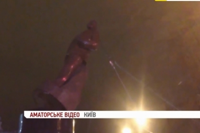 Свідки кажуть: Леніна повалили за лічені секунди. Накинули металевий трос і почали тягнути. Міліція та "Беркут" були поруч, спостерігали, але у дійство не втручались. У пам'ятника внаслідок падіння відвалилася голова. Після цього молодики почали запалювати фаєри. Присутні почали відбивати від монумента шматки та ділитися ними одне з одним як сувенірами. Частину уламків понесли на Майдан Незалежності - показати мітингувальникам. Зараз люди фотографуються на тлі поваленого більшовика.