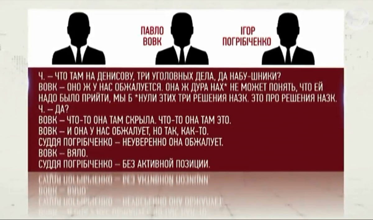 На аудіозаписах можна почути, як судді планують тиснути на уповноваженого Верховної Ради з прав людини Людмилу Денісову, за квотою якої мали призначити члена Вищої кваліфікаційної комісії суддів. В іншому фрагменті судді обговорюють погодження власних дій із міністром внутрішніх справ Арсеном Аваковим.