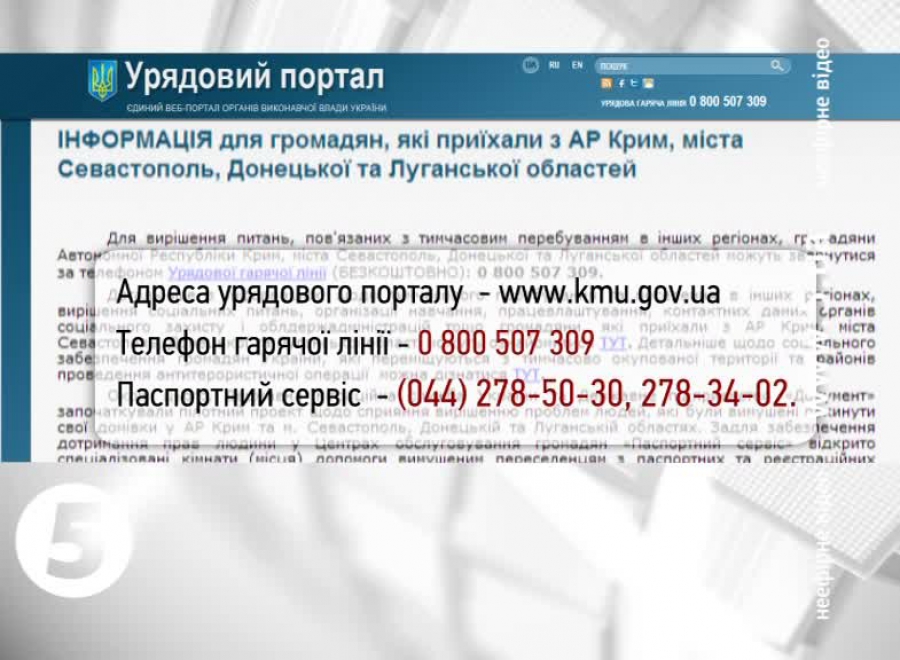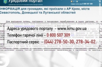 На урядовому сайті зокрема створили сторінку з детальною інформацією. Безкоштовний цілодобовий телефон - його ви зараз побачите на екрані - 0 800 507 309. Там нададуть інформацію щодо вирішення соціальних питань, організації навчання, працевлаштування та контактні телефони органів соціального захисту. Також Державна міграційна служба України та Державне підприємство Документ відкрили спеціалізовані кімнати, де можна буде відновити втрачені посвідчення або паспорти.