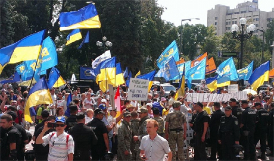 Водії машин безперервно сигналять. В той же час кілька сотень людей, які протестували від самого ранку зробили спробу наблизитися до будівлі парламенту, підхід до якої їм перекрили кілька додаткових загонів міліції та батальйон "Київ-1".