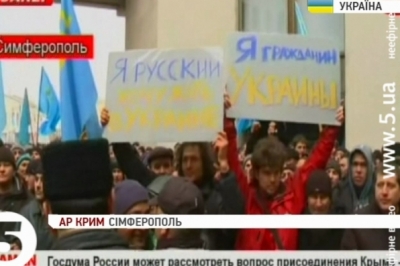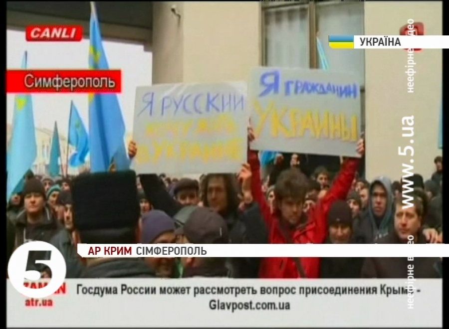Годину тому у Сімферополі біля Ради автономії почався мітинг кримських татар – їх прийшло щонайменше 5 тисяч. Водночас, там зібралися й проросійські сили, їх кількасот і вони очікують на позачергове засідання кримської Верховної Ради. Воно, нагадаємо, почнеться о третій дня. Учасники кількатисячного мітингу татар скандують: «Крим – не Росія!», «Банду геть!», а також «Слава Україні!». Як заявив голова кримського меджлісу Рефат Чубаров – татари не допустять сепаратистських дій в автономії. Водночас, його опонент, лідер руху «Русскоє єдінство» Сергій Аксьонов заявляє, що не допустить зіткнень. Втім, у натовпі періодично виникають сутички, які розбороняють правоохоронці.