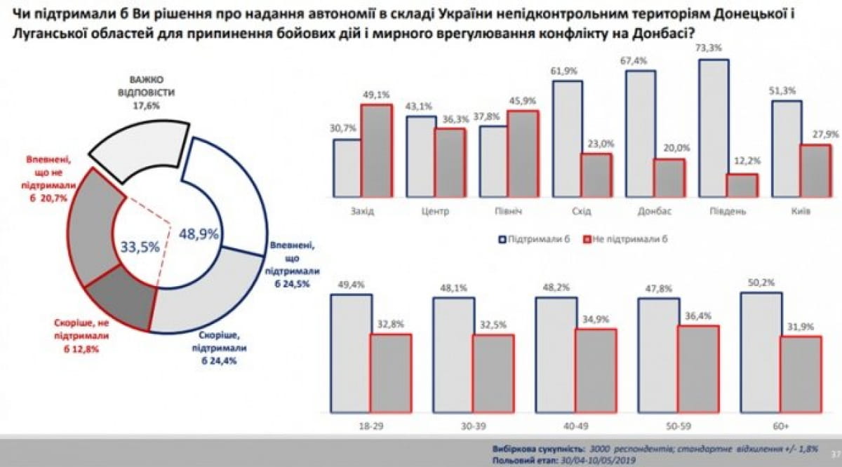 При цьому впевнені, що підтримали б автономію ОРДЛО 24,5%, а скоріше підтримали б – 24,4%. Проти надання автономії Донбасу у складі України 33,5%. Ще 17,6% опитаних не визначилися щодо цього питання.