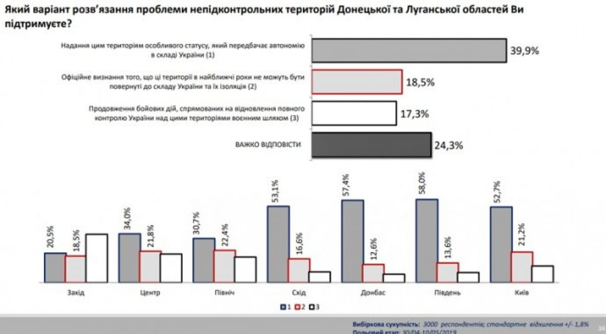 39,9% українців вважають, що для розв'язання проблеми непідконтрольних територій Донбасу треба надати цим територіям статусу автономії в складі України.