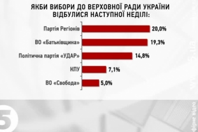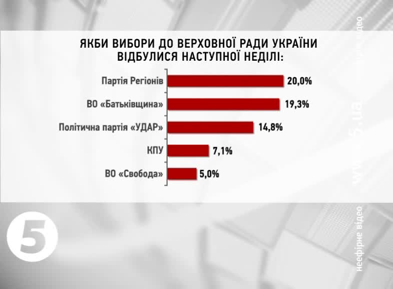 Найбільшу електоральну підтримку отримали б Партія регіонів та «Батьківщина». Віддати свої голоси за провладну партію готові 20% виборців. Підтримка опозиційної сили суттєво не відрізняється - понад 19%. Партії «Удар» довіра українців принесла би майже 15%. За комуністів планують голосувати трохи більше 7% виборців. І рівно 5% отримали б «свободівці».