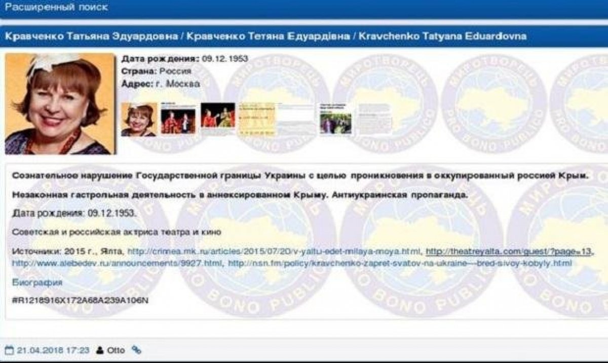 Зірка серіалу "Татусеві дочки" Андрій Леонов та актриси зі "Сватів" Олеся Железняк і Тетяна Кравченко потрапили до списків українського сайту "Миротворець". Причиною став незаконний перетин кордону Криму через Росію і в обхід українського законодавства.
