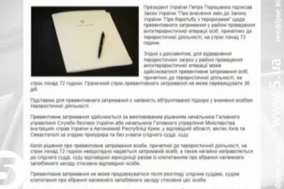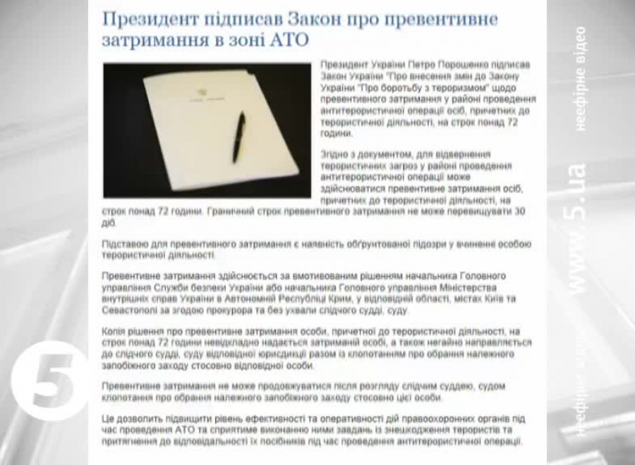 Згідно з документом, відтепер у зоні АТО правоохоронці зможуть затримувати підозрюваних у терористичній діяльності терміном понад 72 години. Втім, строк затримання не може перевищувати 30 діб. Наступним законом Президент розширив права прокурорів у місцях проведення антитерористичної операції.