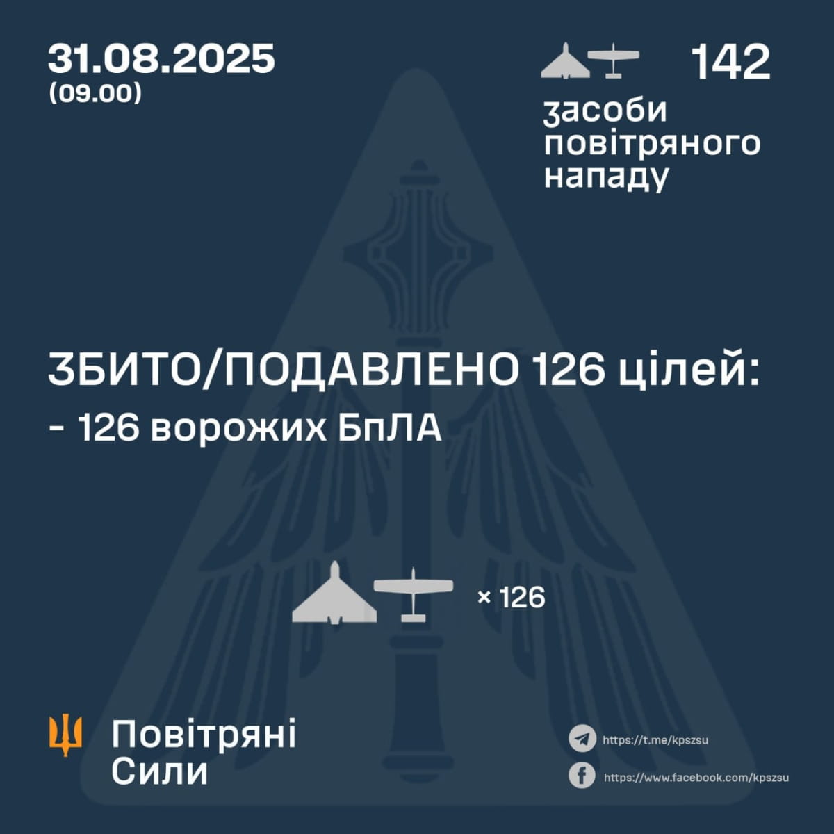 У ніч на 31 серпня противник атакував Україну 142-ма ударними БпЛА типу Shahed і безпілотниками-імітаторами різних типів. Про це повідомляють Повітряні сили.