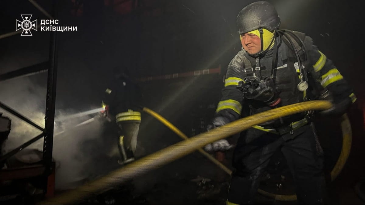 За даними ДСНС, унаслідок ворожої атаки БПЛА у Яготині Бориспільського району виникла масштабна пожежа на території складського комплексу.