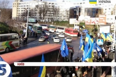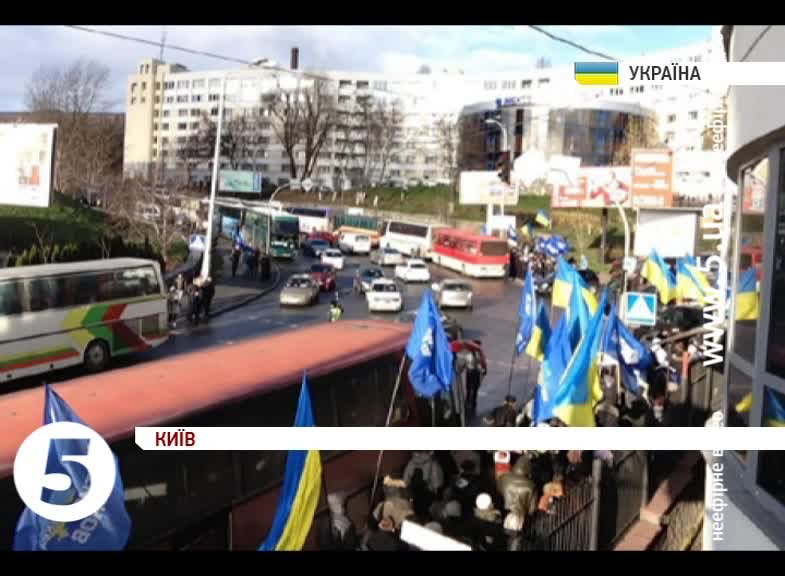 З них виходять люди з прапорами Партії регіонів та національними. Загалом транспортних засобів до сотні. Вони стоять також на проспекті Дружби народів та бульварі Лесі Українки. За повідомленням ЗМІ, біля Кабінету Міністрів багато автобусів з «Беркутом». А біля метро «Арсенальна» чимало молодиків спортивної зовнішності.