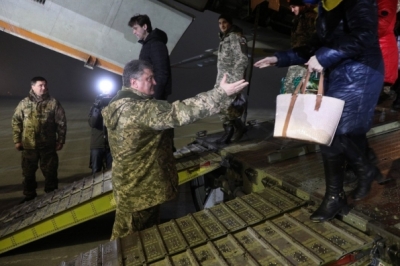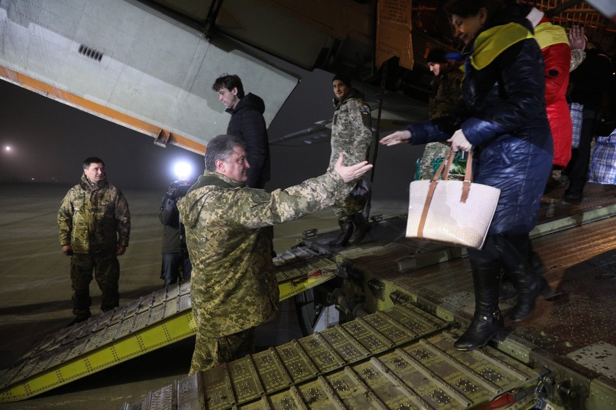 "Велике спасибі, тобі Україно, за те, що ми єдині, за те, що ми вміємо боротися і вміємо перемагати", – зазначив Президент Петро Порошенко після прибуття до Києва разом зі звільненими українськими заручниками, де їх зустрічали родини та небайдужі громадяни. Про це повідомляє прес-служба глави держави.