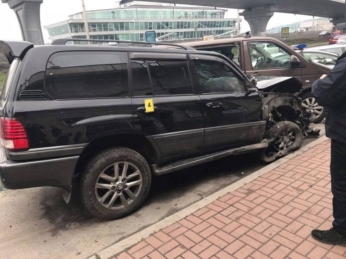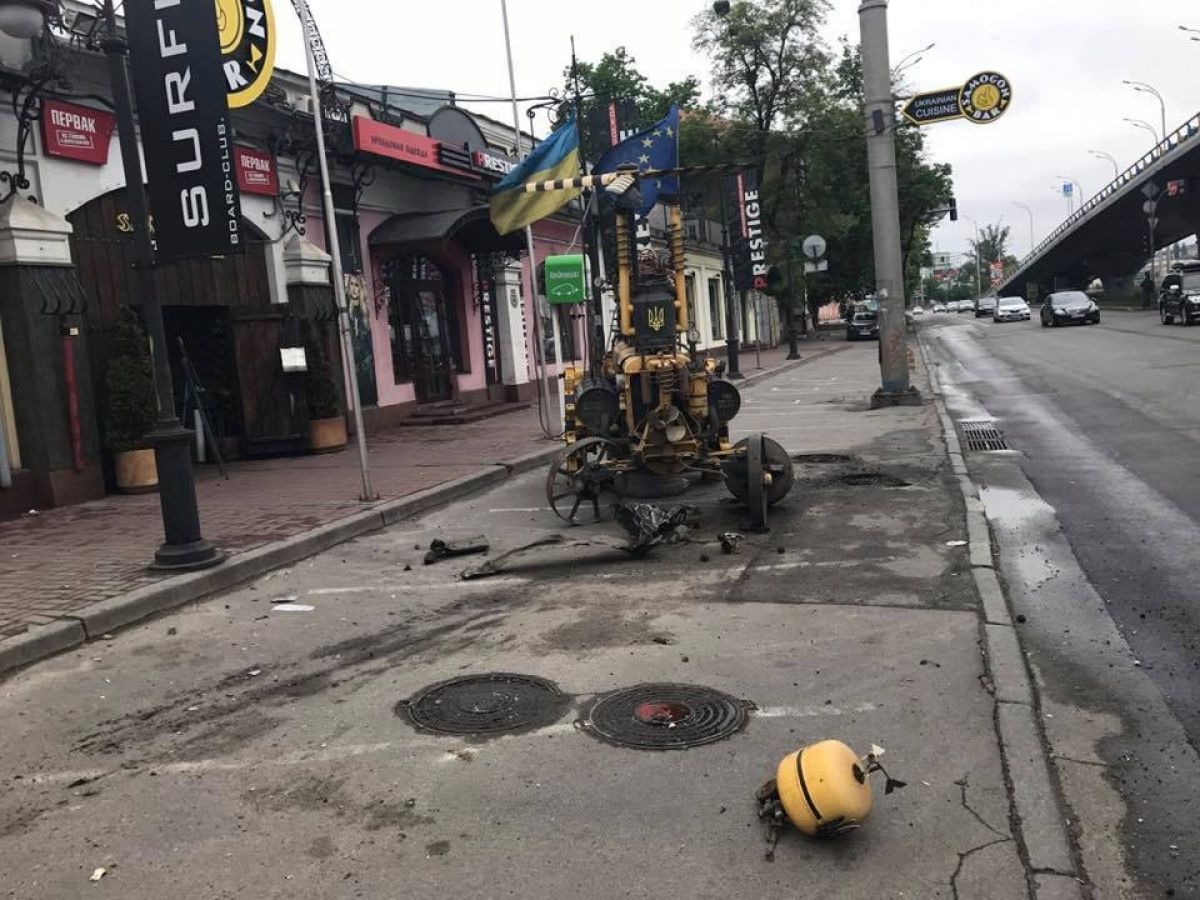 "За даними відеокамер посольства, на Подолі джип "Лексус" держномер АА9777ВЕ зробив епічну аварію: вилетівши на тротуар, зніс пам'ятник з довоєнним трактором навпроти ресторану "Самогон" і врізався через 60 метрів в мікроавтобус", – йдеться в повідомленні.