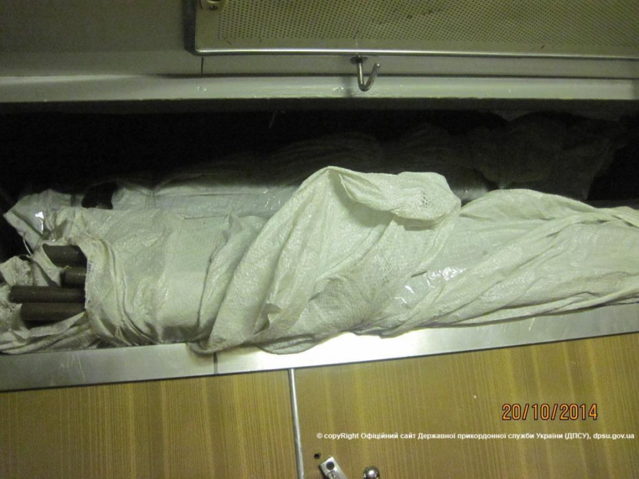 Як зазначено у повідомленні, товар виявили в ході реалізації завчасно отриманої інформації про можливу протиправну діяльність від співробітників СБУ. Під час перевірки одного з вагонів поїзда - у неробочому тамбурі, у шахті для вугілля, у ніші для багажу купе відпочинку провідника, а також в нішах для багажу трьох пасажирських купе вагону було виявлено 36 мішків з трубками діаметром 5 см завдовжки від 60 см до 1,5 метра.