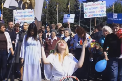 Як повідомляє місцевий портал 6262.com.ua, учасниці "Жінки за мир" урочисто заспівали гімн організації. При цьому, одна із них навіть стала на коліна. Після цього вони заявили про колективне рішення "озеленитися".