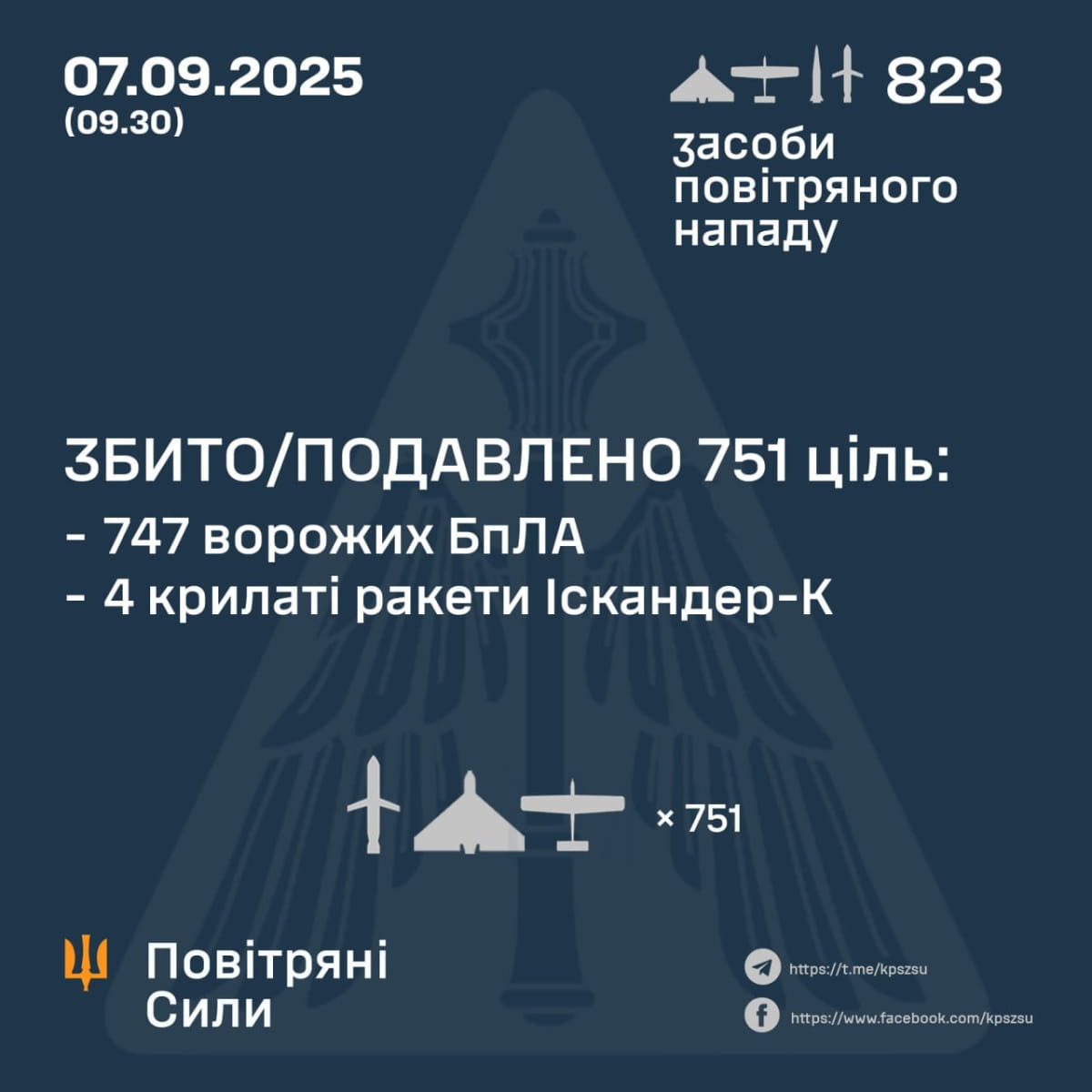 "За попередніми даними, станом на 08.30, протиповітряною обороною збито/подавлено 751 повітряну ціль: 747 ворожих БпЛА типу Shahed і дронів-імітаторів різних типів; 4 крилаті ракети Іскандер-К", – йдеться у дописі.