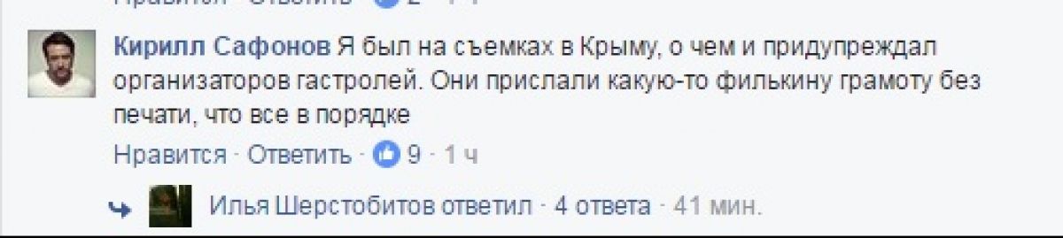 У коментарях до свого посту Сафонов написав також, що був на зйомках у Криму, про що попереджав організаторів фестивалю, натомість вони дали йому документ без печатки і сказали, що все в порядку.