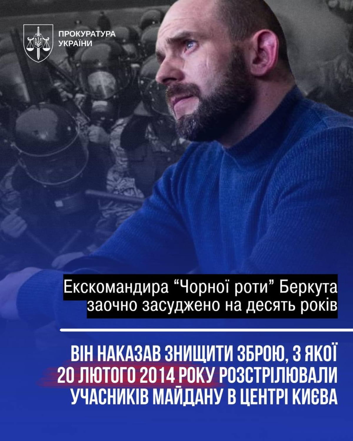 "Прокурори Офісу Генерального прокурора довели в суді провину колишнього командира роти спецпризначення київського полку "Беркут" ("чорної роти"). Його заочно засуджено до 10 років ув'язнення за знищення зброї, з якої 20 лютого 2014 року розстрілювали протестувальників у центрі Києва", – поінформували у відомстві.