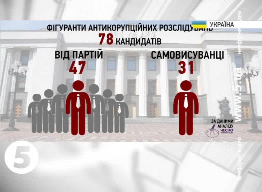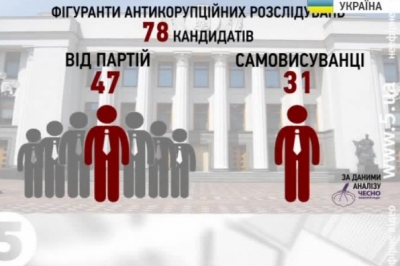 Активісти знайшли серед уже зареєстрованих кандидатів щонайменше 78 фігурантів різних корупційних скандалів. 47 із них балотуються від політичних партій, 31 – як самовисуванець. За критерій бралися журналістські розслідування та публікації у ЗМІ.