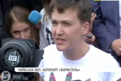 Надія Савченко вийшла до журналістів, які чекали на неї в аеропорту "Бориспіль". Це її перше спілкування із пресою після повернення в Україну. Вона попрямувала в Адміністрацію Президента.