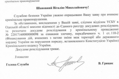 "Щойно отримав від голови СБУ Василя Грицака лист, у якому він повідомив про відкриття кримінального провадження за моєю заявою за ст. 110-2 ККУ "Фінансування дій, вчинених з метою насильницької зміни чи повалення конституційного ладу або захоплення державної влади, зміни меж території або державного кордону України", – написав депутат.