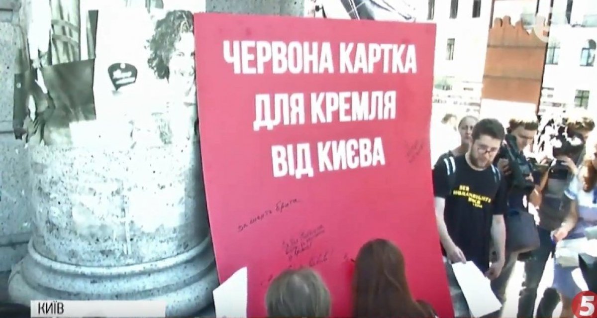 Червона картка Кремлю – як символ бойкоту Чемпіонату світу з футболу, який має прийняти у себе країна-агресор уже 14-го червня. Мітингарі в Одесі наполягають: для підтримки українських бранців необхідно використовувати будь-яку нагоду.