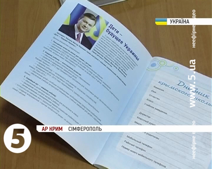 Із символікою Партії регіонів та обличчями партійних лідерів - відтепер такий щоденник у наплічнику кожного кримського школяра. Зі світлин учням усміхається глава держави, головний освітянин країни та депутати-регіонали обрані від автономії.