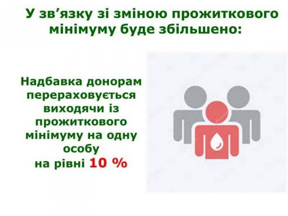 У зв'язку зі зміною прожиткового мінімуму надбавка донорам перераховується, зважаючи на прожитковий мінімум на одну особу на рівні 10%, додають у ПФУ.