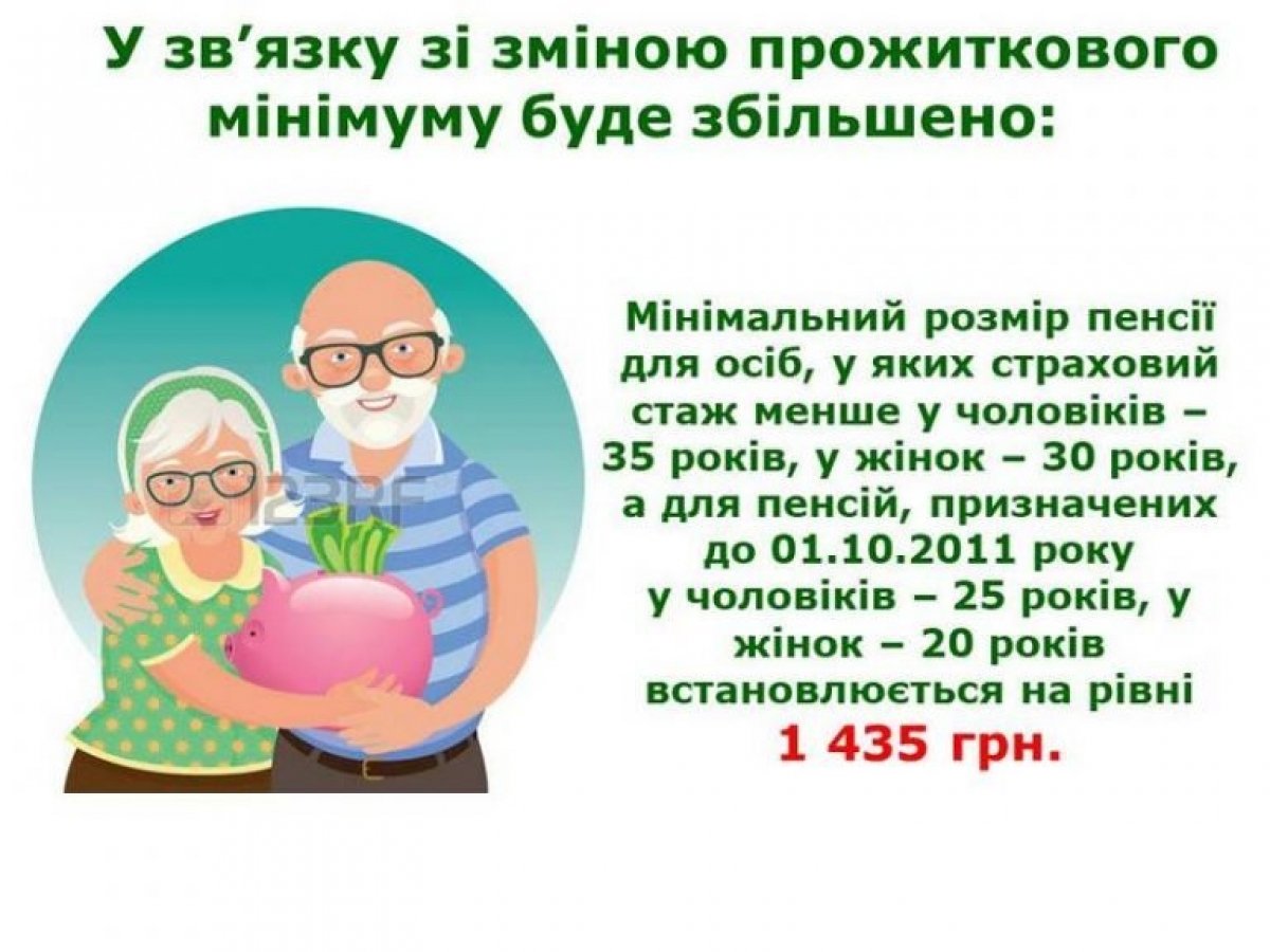 Крім того, у Пенсійному фонді кажуть: мінімальний розмір пенсії для осіб, у яких страховий стаж менше як 35 років у чоловіків та 30 років у жінок, а для пенсій, призначених до 1 жовтня 2011 року, у чоловіків − 25 років, у жінок − 20, становитиме 1435 грн.