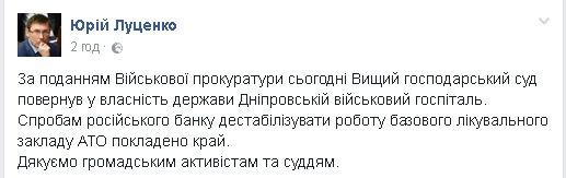 "Спробам російського банку дестабілізувати роботу базового лікувального закладу АТО покладено край. Дякуємо громадським активістам та суддям", – додав Луценко.