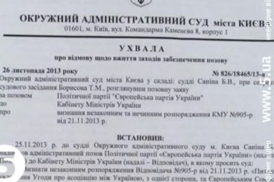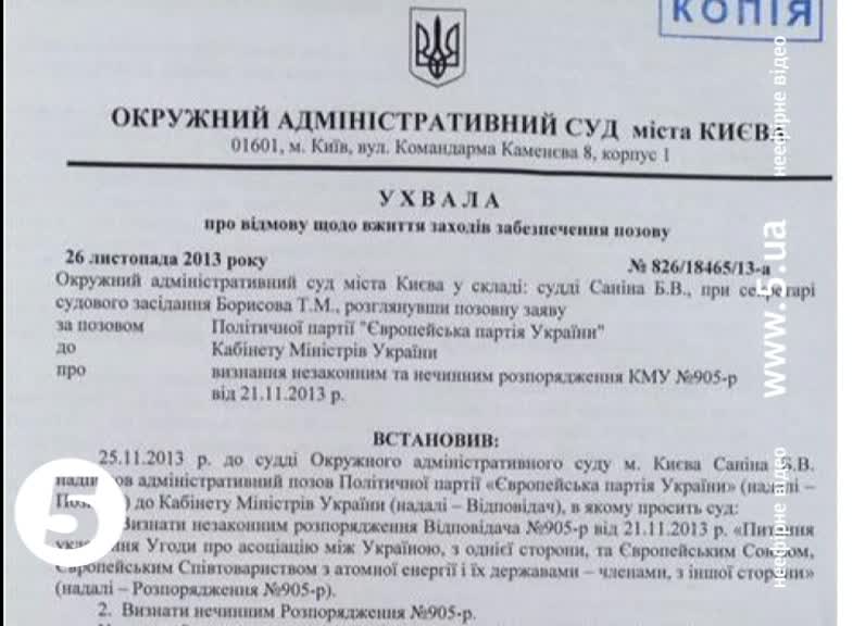 Позов подала європейська партія. У ньому йдеться про те, що рішення уряду нібито протирічить кільком законам і порушує права українців. З фотокопії рішення суду стало відомо, що засідання у цій справі відбудеться рівно за два тижні - 10 грудня о 13.30. А підписувати чи не підписувати Угоду про асоціацію Київ і Брюссель мають вирішити у ці четвер-п'ятницю на саміті у Брюсселі.