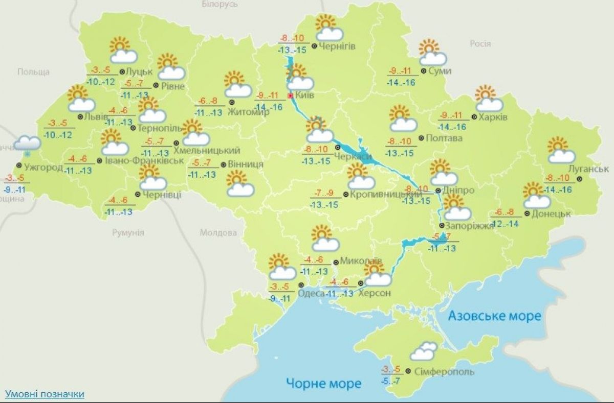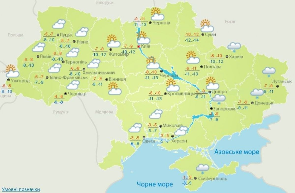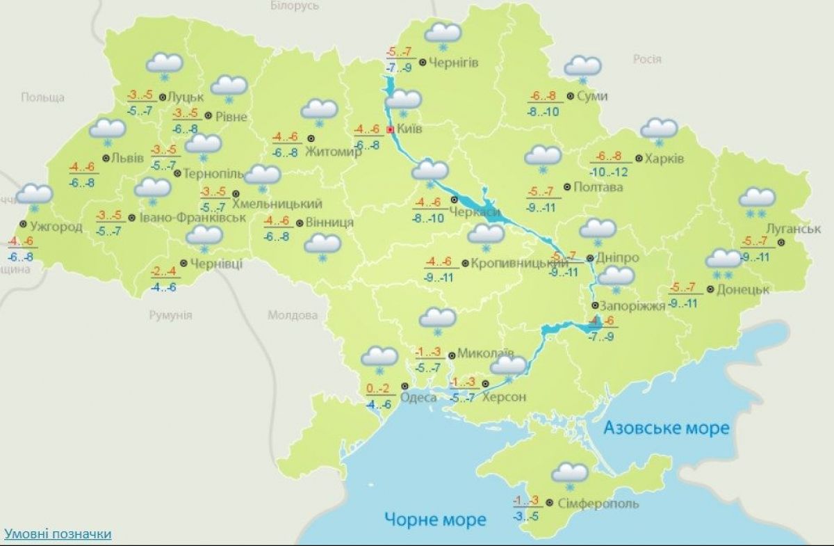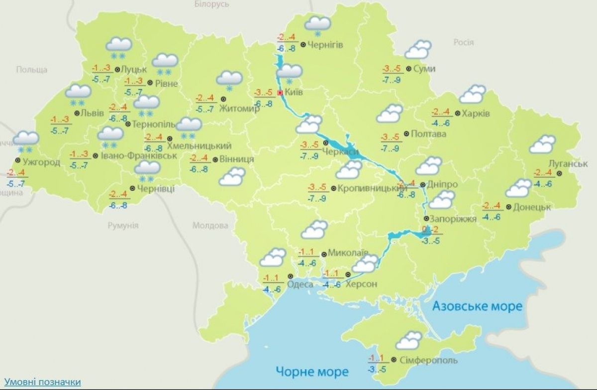 "У західних, вночі і в східних областях помірний сніг, вдень в північних областях невеликий сніг, на решті території без істотних опадів. На дорогах більшості областей ожеледиця. Вітер південно-західний, 5-10 м/с. Температура вночі -4...-9°С, у центральних областях та на півночі Лівобережжя до -12°С, вдень -1...-6°С, на півдні країни близько 0°С; в Карпатах вночі -10...-15°С, вдень -7...-12°С", – йдеться у повідомленні.