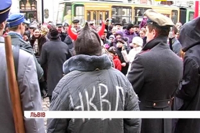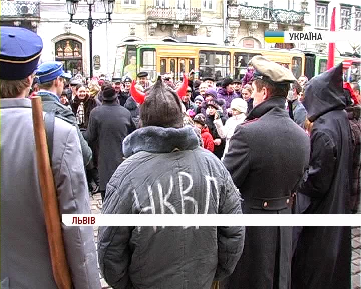 Це львівський вертеп. Окрім традиційних персонажів - Марії, Йосипа, ангелят і царя Ірода – тут і воїни Української повстанської армії. У ролі ж чортенят – представники НКВС. Молодь каже, у такий спосіб демонструють боротьбу за незалежну Україну.