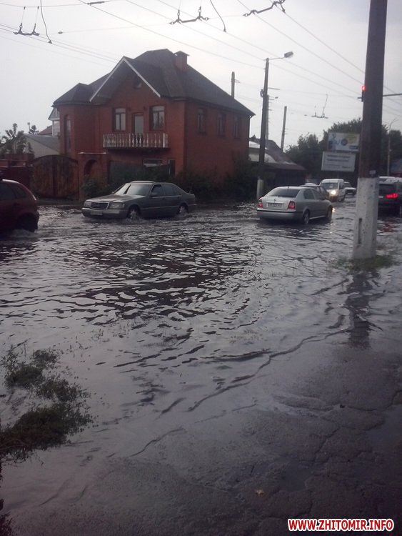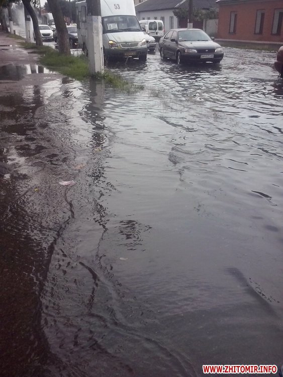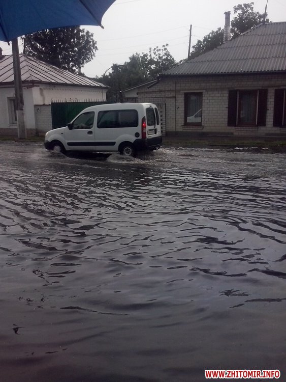 Житомир накрила потужна злива, що затопила центральні вулиці міста. Про це пише видання Zhzh.info. Як зазначають очевидці, злива була настільки сильною, що вода зривала шматки асфальту, дошки тощо.