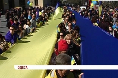 Для цього активісти продавали національні стяги, аби їх одесити потому повісили на своїх балконах. Так прагнули показати, що Одеса – українське місто. Також учасники антивоєнного маршу розгорнули величезний національний прапор через усю вулицю Дерибасівську. Довжина синьо-жовтого полотна сягнула тисячі метрів. Учасники ходи під гаслами “Одеса - не Росія” та “Україна – мирна країна” пройшли через центр міста та завершили ходу біля пам’ятника невідомому матросу.