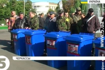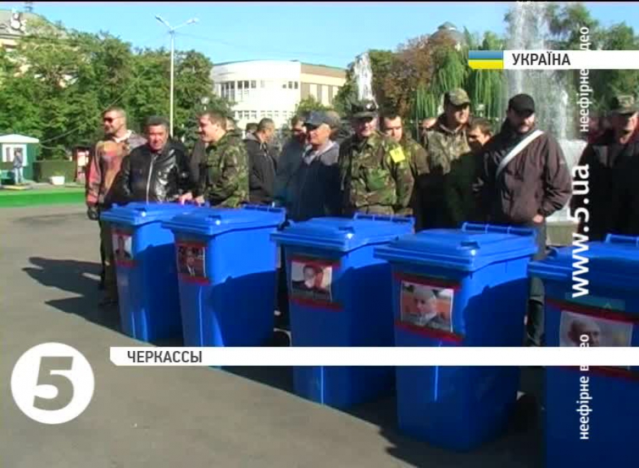Близько півсотні громадських активістів принесли на сесію обласної ради сміттєві баки з фотографіями політиків. Після виконання гімну та вигуків "люстрація", мітингарі заходилися приміряти сміттєві баки на окремих депутатів. Організатори заходу кажуть: такою акцією наполегливо рекомендують нечесним кандидатам добровільно знятися з виборів.