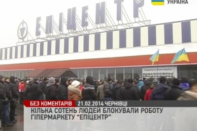 Кілька тисяч людей блокували роботу гіпермаркету «Епіцентр» у Чернівцях. Мовляв, керівництво закладу спонсорує силовиків, яких доправляють на Майдан. Мітингарі обступили магазин із вимогою терміново припинити роботу. На підтвердження серйозності власних намірів, люди розтрощили портрет Віктора Януковича. Після цього до активістів, а це переважно працівники місцевих ринків. Вийшов один із адміністраторів і запевнив, що гіпермаркет закриють до завершення революційних подій в країні. Більше того, стануть надавати допомогу мітингарям у Києві. Охорона магазину невідкладно у присутності активістів опломбувала приміщення. Як відомо, власниками мережі українських гіпермаркетів, є подружжя Олександра та Галини Герег – депутата від ПР та секретаря Київради. До слова близько п’ятої вечора Олександр Герега вийшов зі складу партії. Галина, учасниця мітингу: «Ми проти нашої банди. Ми хочемо щоб магазин був закритий, щоб кошти ішли не на «Беркут», а на Майдан». Микола Двірничук, учасник мітингу: «Багато людей висловили думку, що неможливо торгувати у такі хвилини, і треба щось робити». Володимир Боднарук, в. о. директора гіпермаркет «Епіцентр», м. Чернівці: «Це демократичне рішення. Треба закрити, ми закриємо. Щодо допомоги Майдану, ми будемо надавати засоби захисту, але ніяк не засоби нападу. Це будуть каски, респіратори і рукавиці».