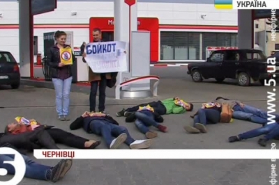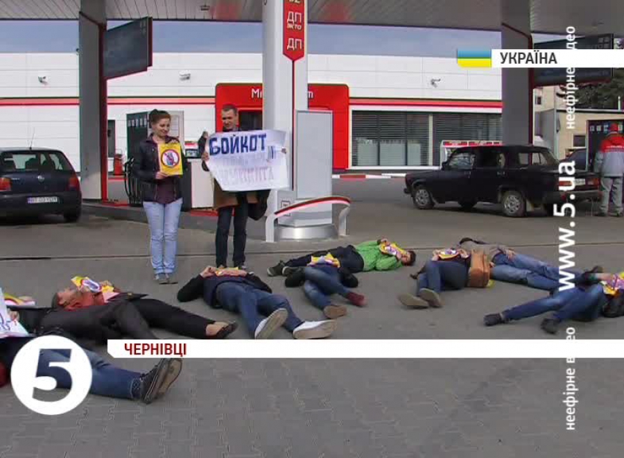 Вони одночасно упали на підлогу – таким чином демонструючи, що російські товари убивають. Інші – розгорнули плакати з закликами бойкотувати придбання товарів із штрих-кодом 46. Перші цифри свідчать про країну виробника – у цьому разі продукція виготовлена в РФ. Також таку акцію учасники флеш-мобу повторили на АЗС, які належать російським власникам.