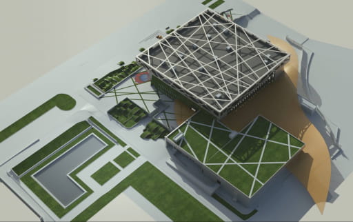 Озеленення навколо будівлі у проекті вже назвали "дніпровськими хвилями". Увесь газон планується збудувати у формі хвиль Дніпра. Поблизу головних сходів організатори хочуть створити стрічку миру – символ єднання людей та народів. Це буде відкритий фонтан зі звуковими ефектами.