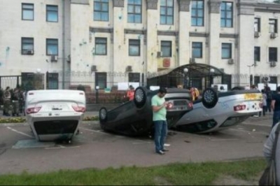 Міліціонери, які тільки спостерігали за тим, що відбувається, зникли. Водночас, біля амбасади з'явилися люди в масках. Хто вони невідомо. Активісти власноруч спустили російський прапор. На їхнє переконання, у день жалоби за загиблими українськими військовими, триколор також мусить бути приспущений.