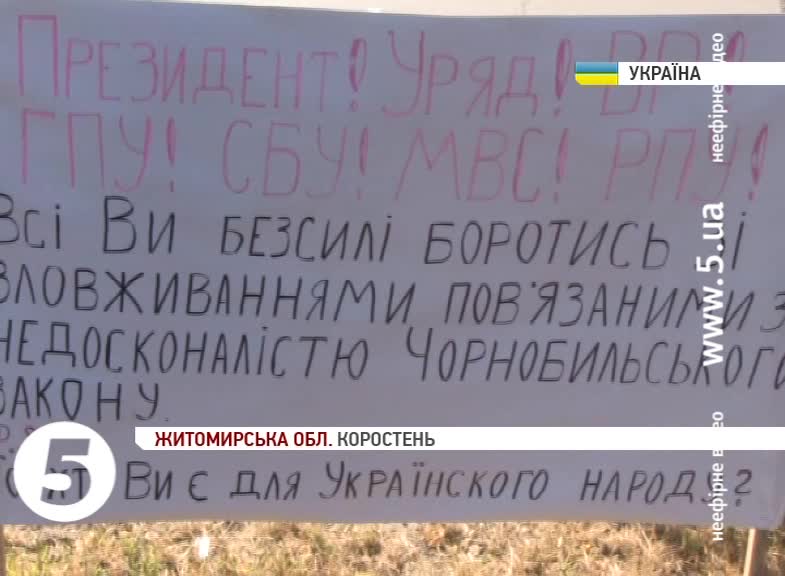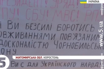 Вони не згодні з висновком експертів Національної комісії радіаційного захисту населення України, за яким передбачається ліквідація частини зон постраждалих унаслідок аварії на ЧАЕС. Мітингувальники обурені через такі дії чиновників, людей, які живуть на забруднених територіях, позбавлять пільг. Насамперед мешканців північних районів Житомирщини непокоїть, що їхні діти не зможуть безкоштовно отримувати путівки на оздоровлення у санаторіях та харчуватися державним коштом у школах і дитсатках регіону. П`ять днів тому активісти оголосили безстрокову акцію протесту, розгорнули наметове містечко і вимагають від місцевих депутатів втрутитися у ситуацію.