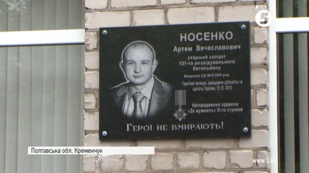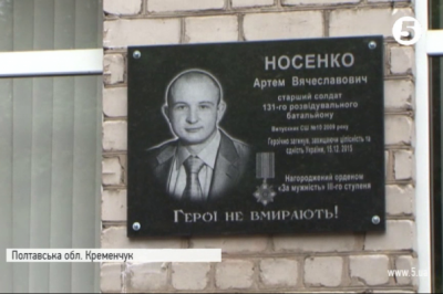 У Кременчуці меморіальною дошкою вшанували пам'ять старшого солдата Артема Носенка. Табличку встановили на школі, де він навчався.