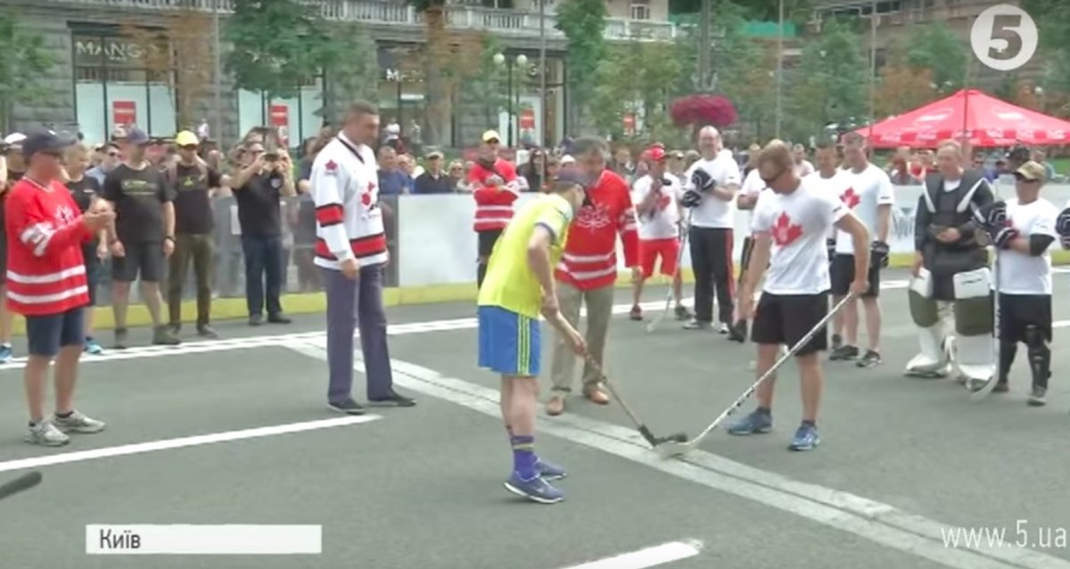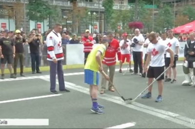 Замість шайби - м'яч, замість криги - асфальт. Хокейними матчами на Хрещатику відзначають 150-річчя Канади. Спершу грають канадські та українські військові.