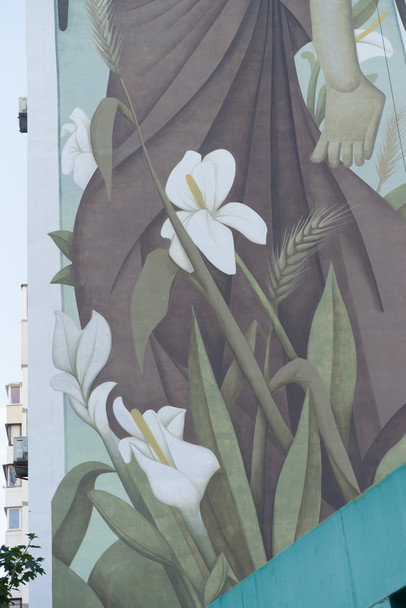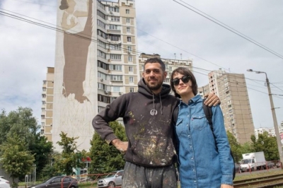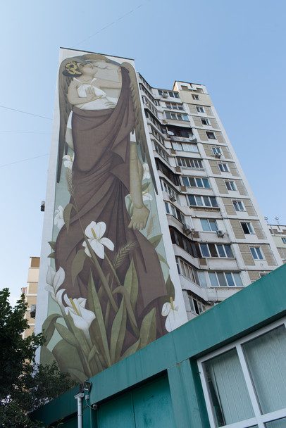 Грецький вуличний художник Fikos Antonios прикрасив столичний 16-поверховий будинок по вулиці Ахматової, 4 найбільшою в світі візантійською фрескою, передає "Новое время". Робота називається "Земля й небо". На ній зображені чоловік і жінка у стилі візантійського живопису.