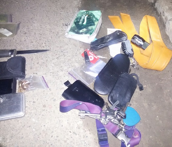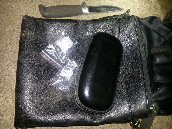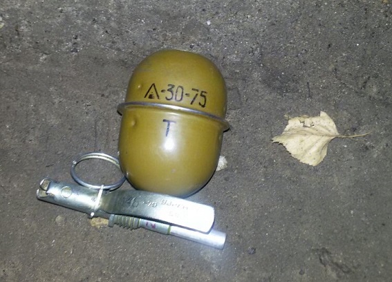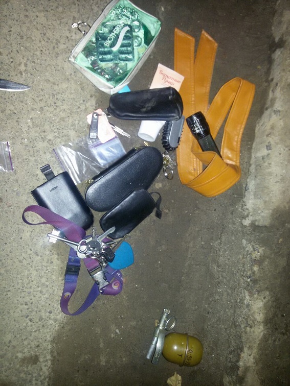 Відзначається, що в ході обшуку в кишенях чоловіка виявили ніж, гранату РГД-5 та речовини, схожі на амфетамін та маріхуану, а також пакетик з ювелірними прикрасами. Згодом в автомобілі, на якому, за інформацією свідків, пересувався чоловік, правоохоронці виявили два ножі та патрон.