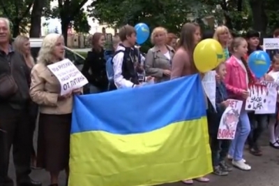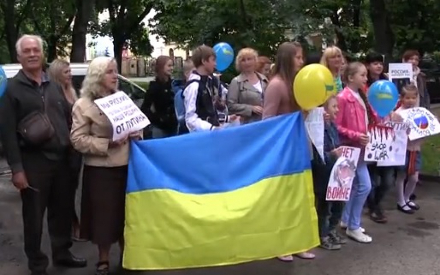 Учасники акції пояснили: "Ми так можемо, хай нецензурно, але все-таки виразити громадянський протест. Адже зараз в мирний час із-за якогось одного шизіка, вибачайте мене, гинуть наші молоді хлопці. Коли ми були найслабшими – вони нас вдарили в спину. Нам допомагають чехи, поляки, вони лікують наших людей, вони нас підтримують як можуть. А ті, хто себе називали нашими братами – виявились паскудами".