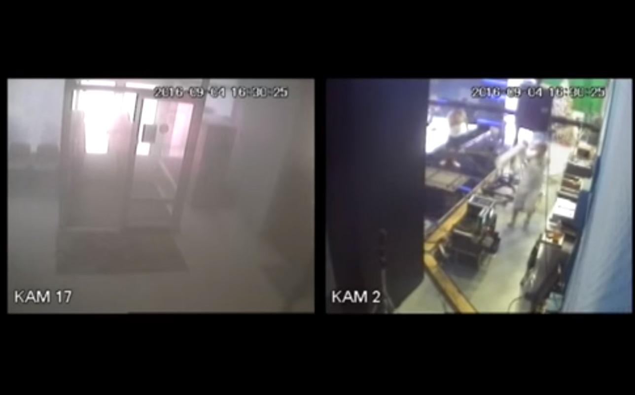 На відеоролику видно, як група осіб у білих касках та медичних масках забігають до офісу та розпилюють порошок із вогнегасника, внаслідок чого зображення з відеокамер стає нечітким.