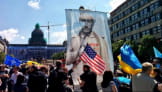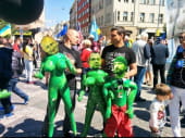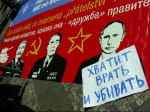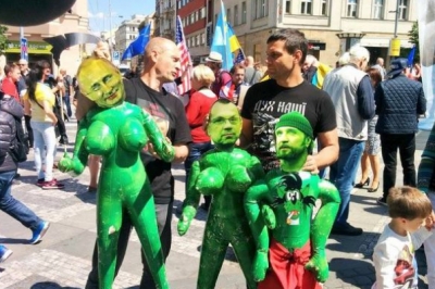 Пражани вийшли на вулиці із велетенськими карикатурами, на яких Путін зображений у вигляді покруча Сталіна з Гітлером. Також він і його поплічники на зразок ватажка "вовків" Залдастанова зображені у вигляді специфічних надувних "зелених чоловічків". Учасники акції також несуть плакати із написами про те, що чехи добре пам’ятають що таке "дружба" правителів Росії, закликами "Досить брехати і вбивати" та прапори України, кримських татар, США і НАТО.
